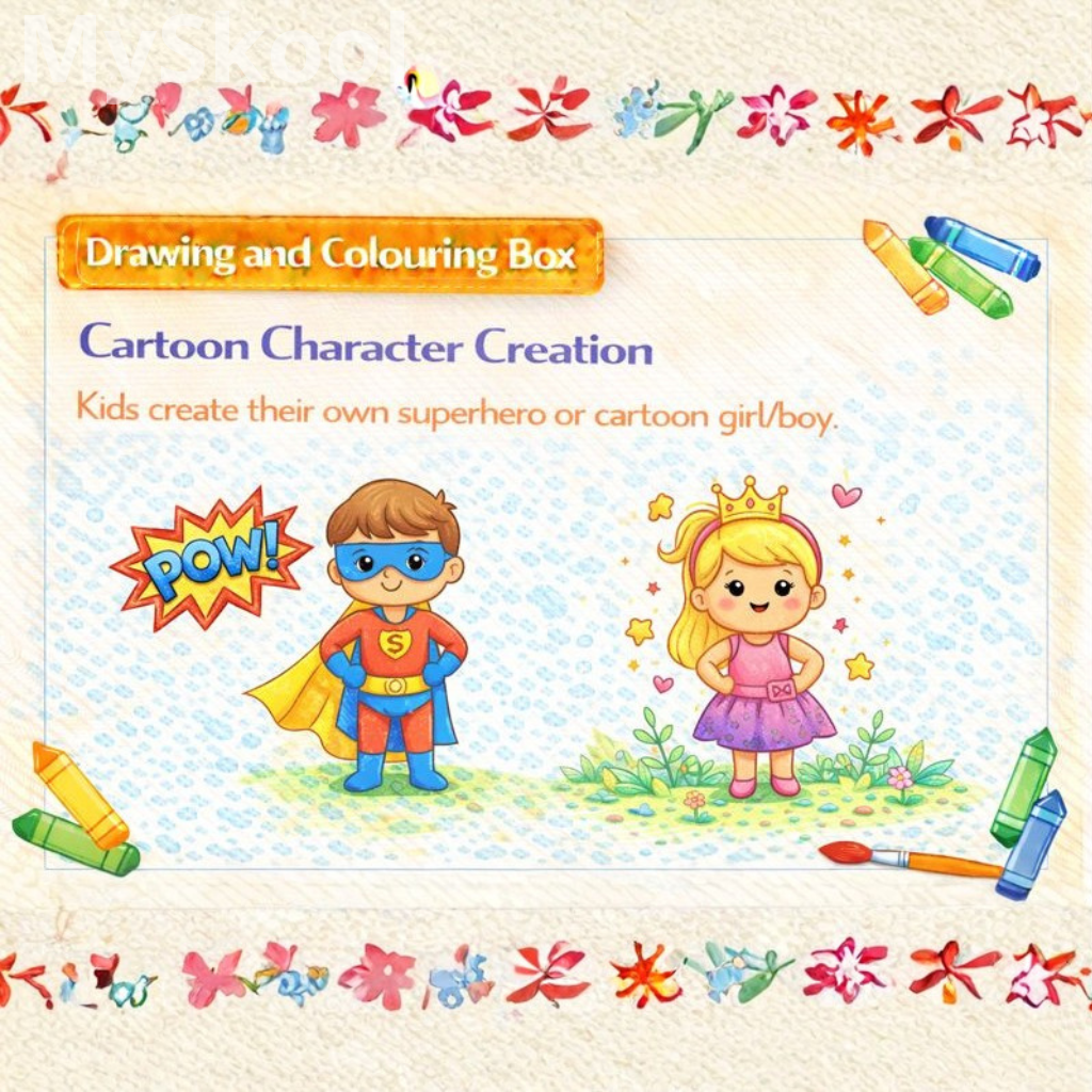 Students sketch a basic character structure. Facial expressions and outfits are added. Special powers or features are designed. Colours enhance personality. Each character becomes unique and expressive.