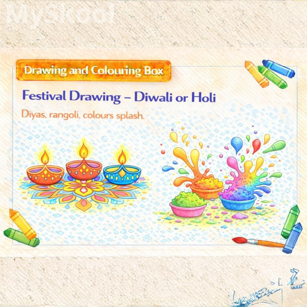 Children draw diyas or colours. Decorative elements are added. Bright colours are used. The drawing shows celebration. Cultural connection develops.