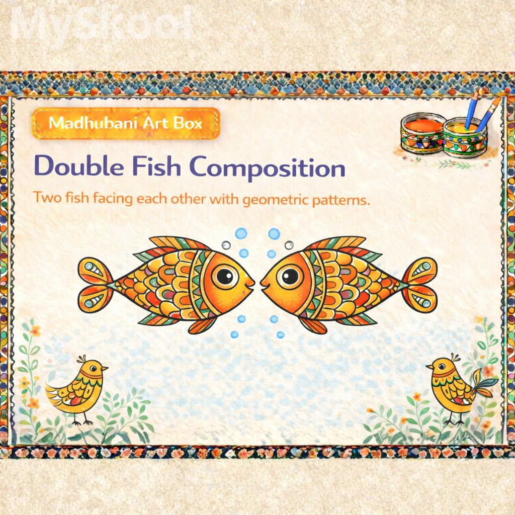 Children place two fish opposite each other. Patterns are filled evenly. Borders may be added. Colours are balanced. The activity improves composition understanding.