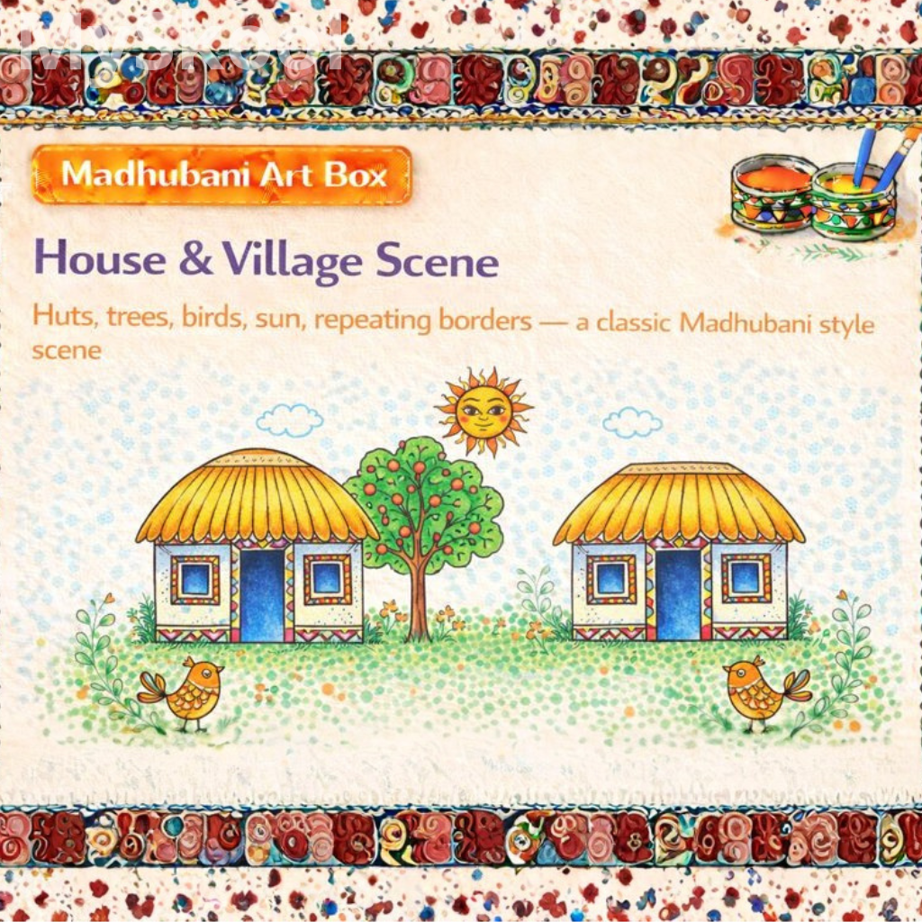 The objective is to introduce landscape composition. It improves spatial arrangement. Children learn repetition of houses. The activity builds patience. Storytelling expands.
