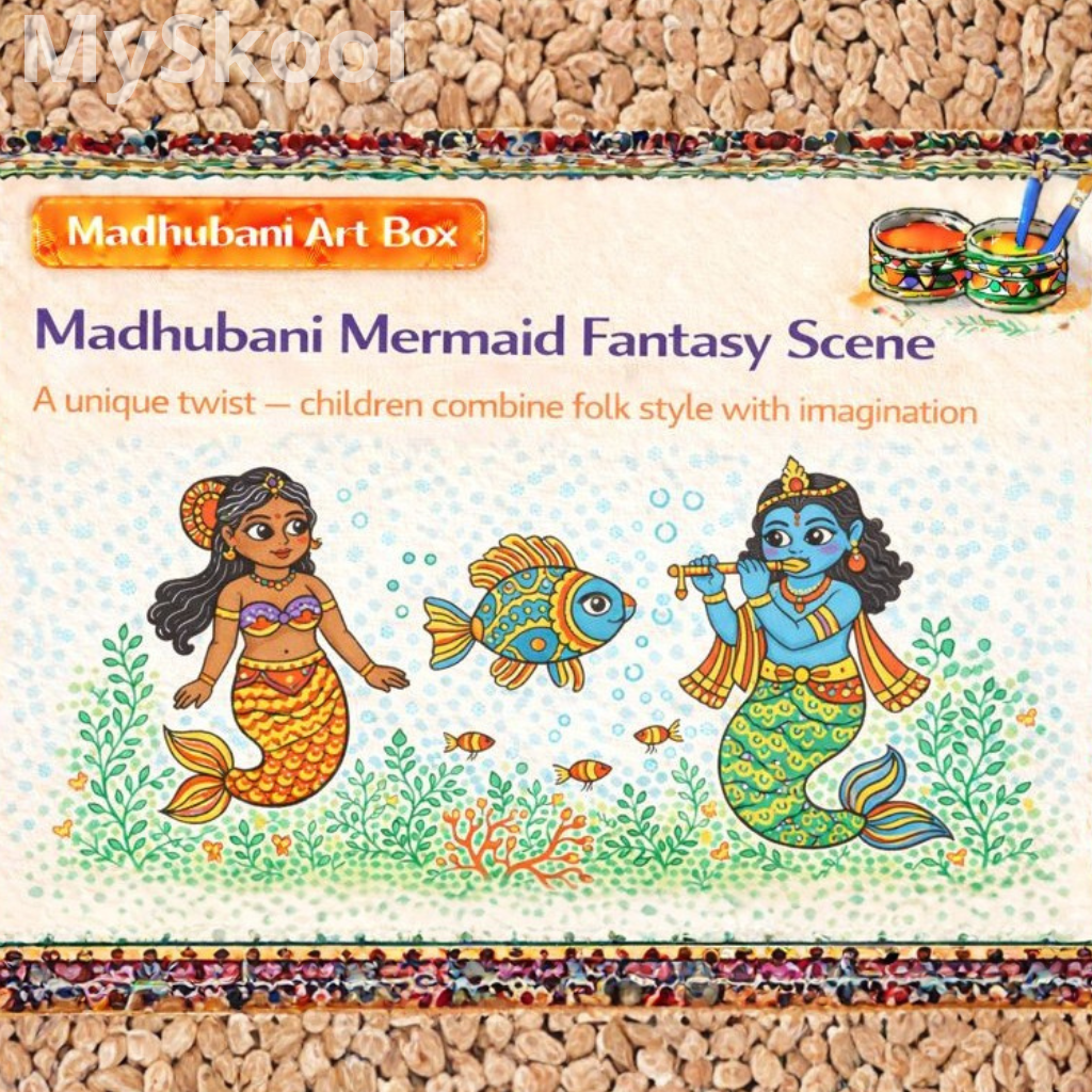 The objective is to blend tradition with imagination. It improves creative confidence. Children learn stylised figures. The activity builds originality. Expression grows.