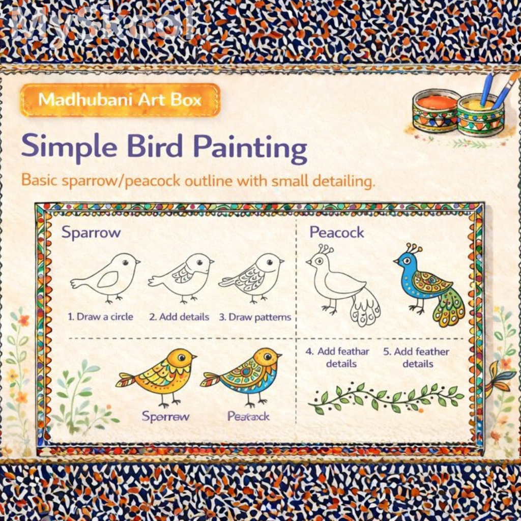 This activity introduces birds commonly seen in Madhubani art. It improves outline drawing and pattern filling. Children learn basic body parts. The activity supports creativity. Focus and neatness improve.