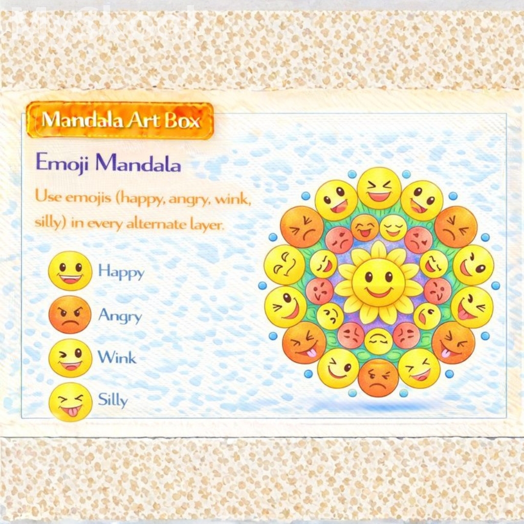 Children draw emoji faces in circles. Rings alternate with patterns. Colours highlight expressions. The mandala feels lively. Emotions connect with art.