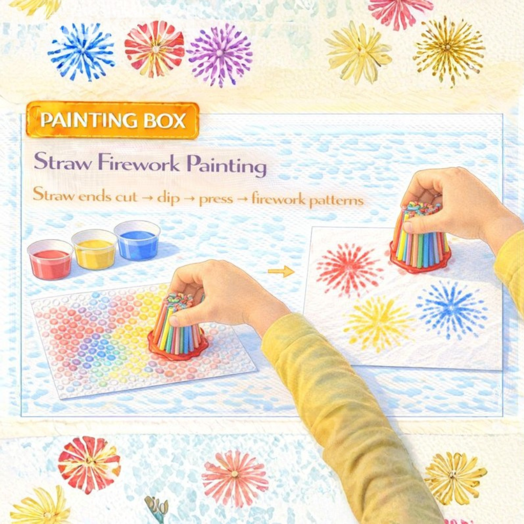 Straw ends are cut into shapes. Paint is applied. Straws are pressed onto paper. Firework patterns appear. Children feel excited.